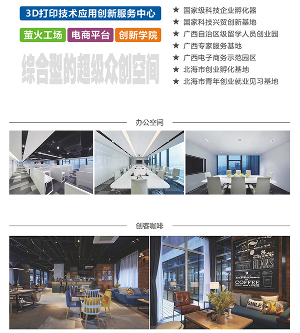 中電北海產(chǎn)業(yè)園眾創(chuàng)空間規(guī)劃面積5000平方米,重點(diǎn)圍繞智慧城市、智能硬件、物聯(lián)網(wǎng)、移動(dòng)互聯(lián)網(wǎng)、大數(shù)據(jù)、電子商務(wù)等重點(diǎn)新型產(chǎn)業(yè)領(lǐng)域,采取互聯(lián)網(wǎng)+現(xiàn)場(chǎng)服務(wù)的模式,整合上下游資源,為入住企業(yè)和創(chuàng)業(yè)者提供政策咨詢、科研支持、人才引進(jìn)、電商培訓(xùn)、創(chuàng)業(yè)指導(dǎo)、融資對(duì)接等服務(wù),形成支持創(chuàng)新創(chuàng)業(yè)的生態(tài)圈。中電北海產(chǎn)業(yè)園眾創(chuàng)空間通過整合各方資源,已經(jīng)集成一批面向區(qū)域主導(dǎo)產(chǎn)業(yè)的前沿技術(shù),整合了戰(zhàn)略投資基金、天使基金和社會(huì)投資相結(jié)合的創(chuàng)新創(chuàng)業(yè)投資基金,建立了涵蓋科學(xué)家、創(chuàng)業(yè)企業(yè)家和企業(yè)運(yùn)營(yíng)管理專家的創(chuàng)業(yè)導(dǎo)師團(tuán)隊(duì),聚集電商平臺(tái)、3D打印技術(shù)應(yīng)用創(chuàng)新服務(wù)中心、創(chuàng)新學(xué)院、螢火工場(chǎng)實(shí)驗(yàn)室等一體化服務(wù)機(jī)構(gòu)構(gòu)成綜合型的超級(jí)眾創(chuàng)空間。