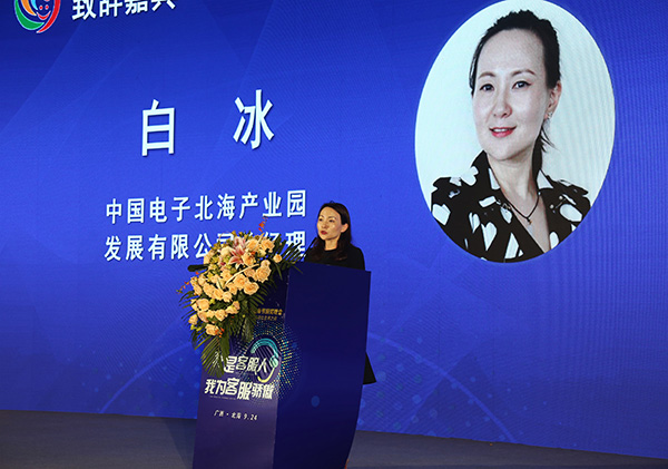 中國(guó)電子北海產(chǎn)業(yè)園公司總經(jīng)理白冰在頒獎(jiǎng)晚會(huì)上致辭